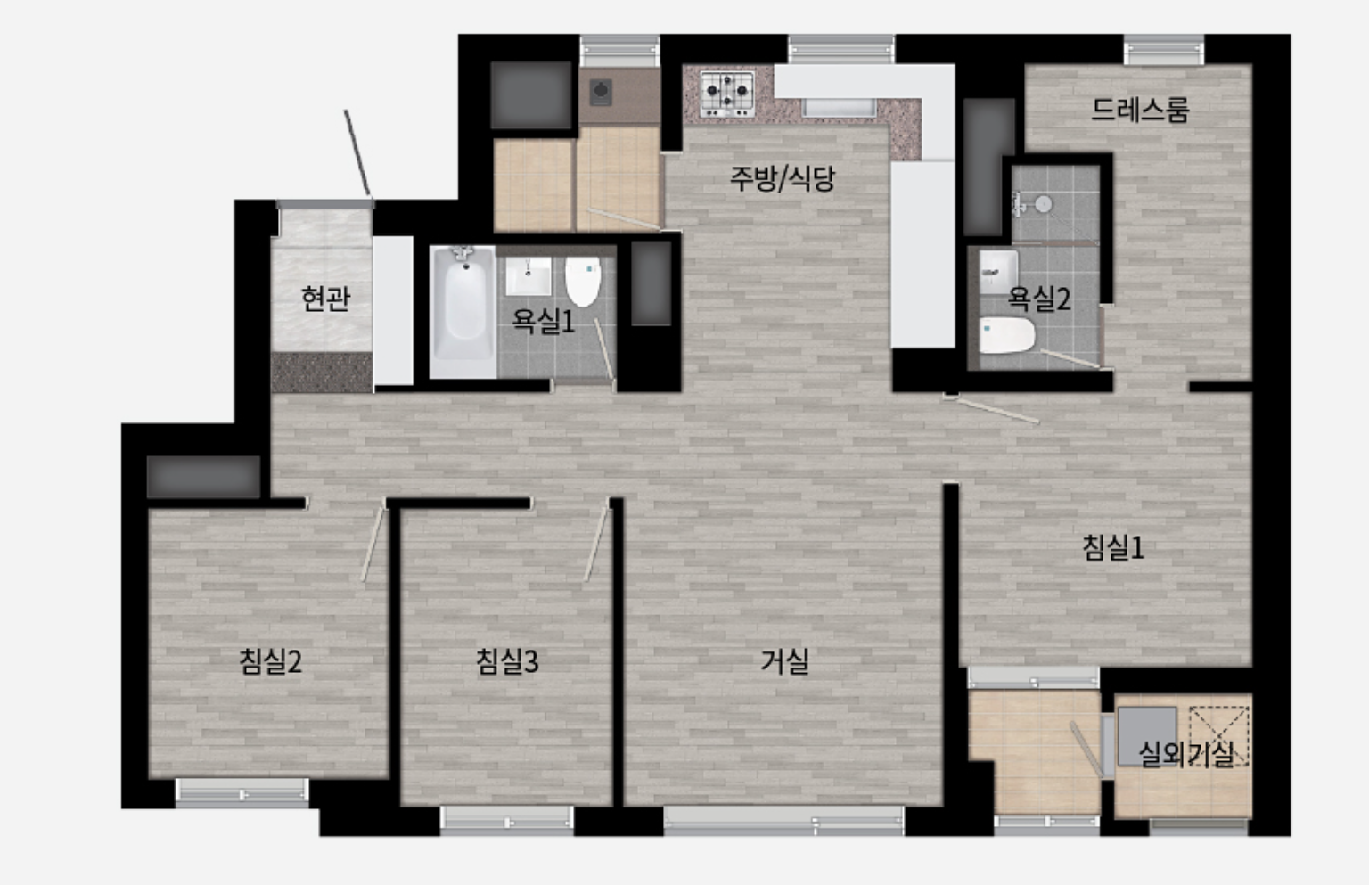 59 타입인데도 침실 3개에 욕실 2개이고 심지어 드레스룸까지 있습니다. 신혼부부와 애기가 있는 가정에게도 정말 좋을 것 같습니다. 요즘같이 소규모 가족이 많은데 잘 타깃 한 것 같습니다.